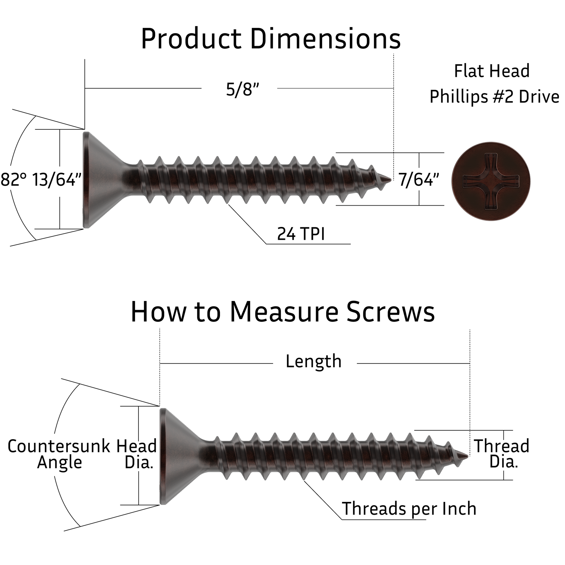 - Flat head wood screws are sized at #4 x 5/8" and feature an 82-degree countersink, allowing the cabinet screws to be set flush with the surface.