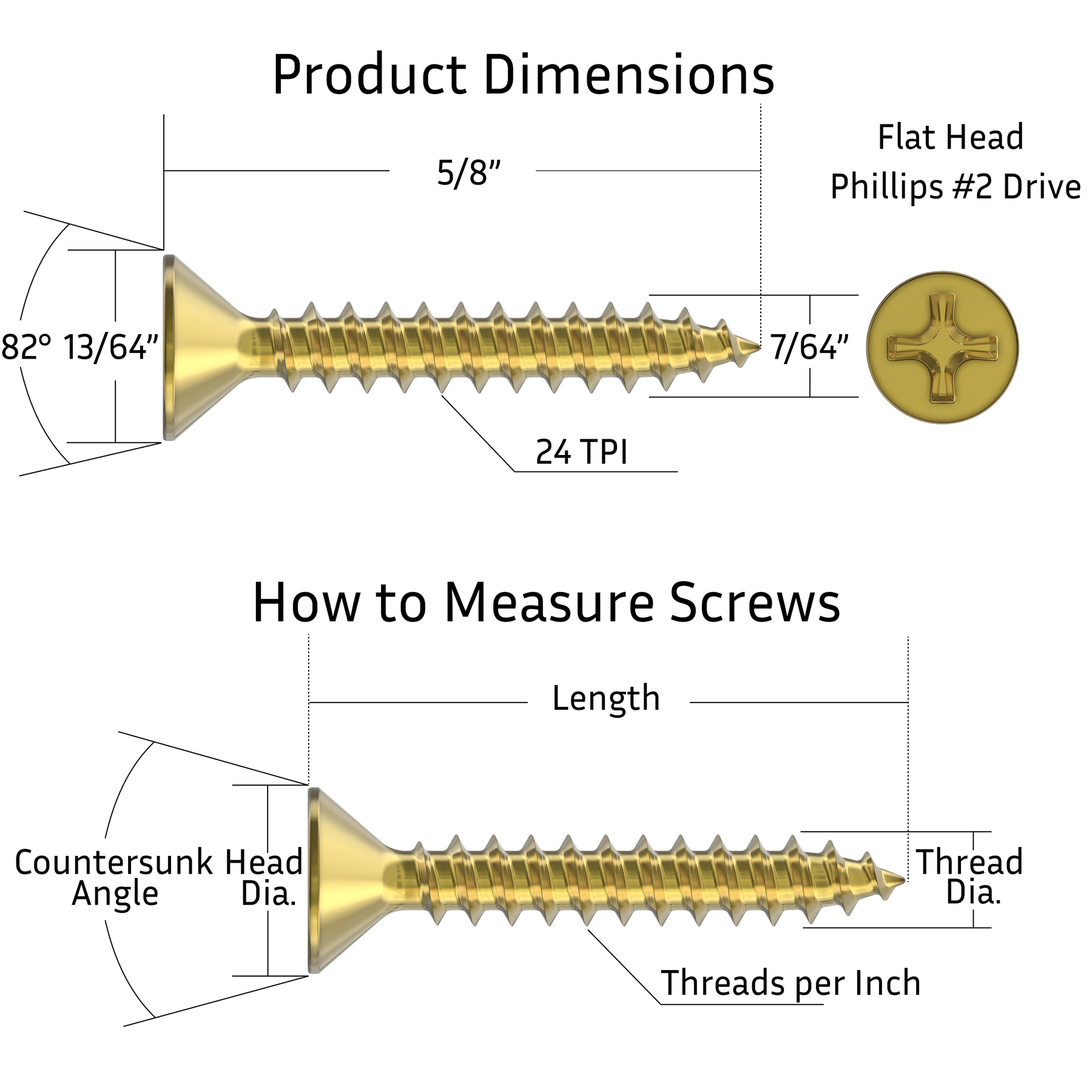 • Flat head wood screws are sized at #4 x 5/8" and feature an 82-degree countersink, allowing the cabinet screws to be set flush with the surface.