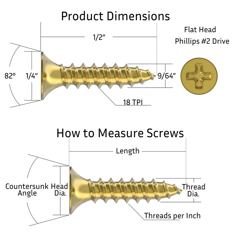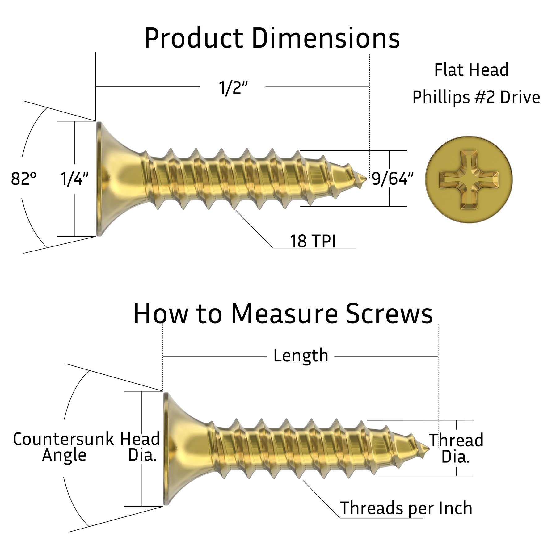 - Flat head wood screws are sized at #6 x 5/8" and feature an 82-degree countersink, allowing the cabinet screws to be set flush with the surface.