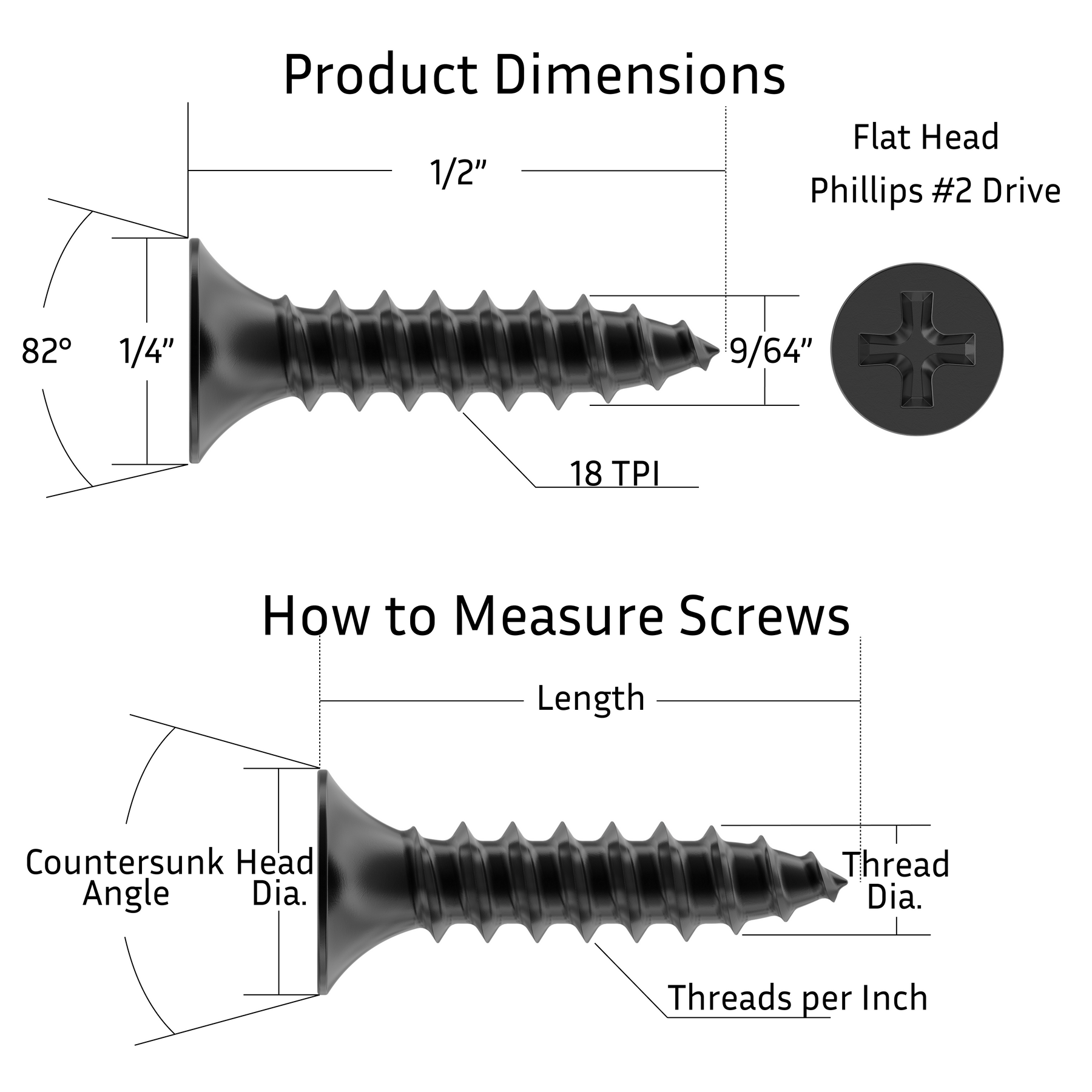 - Flat head wood screws are sized at #6 x 5/8" and feature an 82-degree countersink, allowing the cabinet screws to be set flush with the surface.