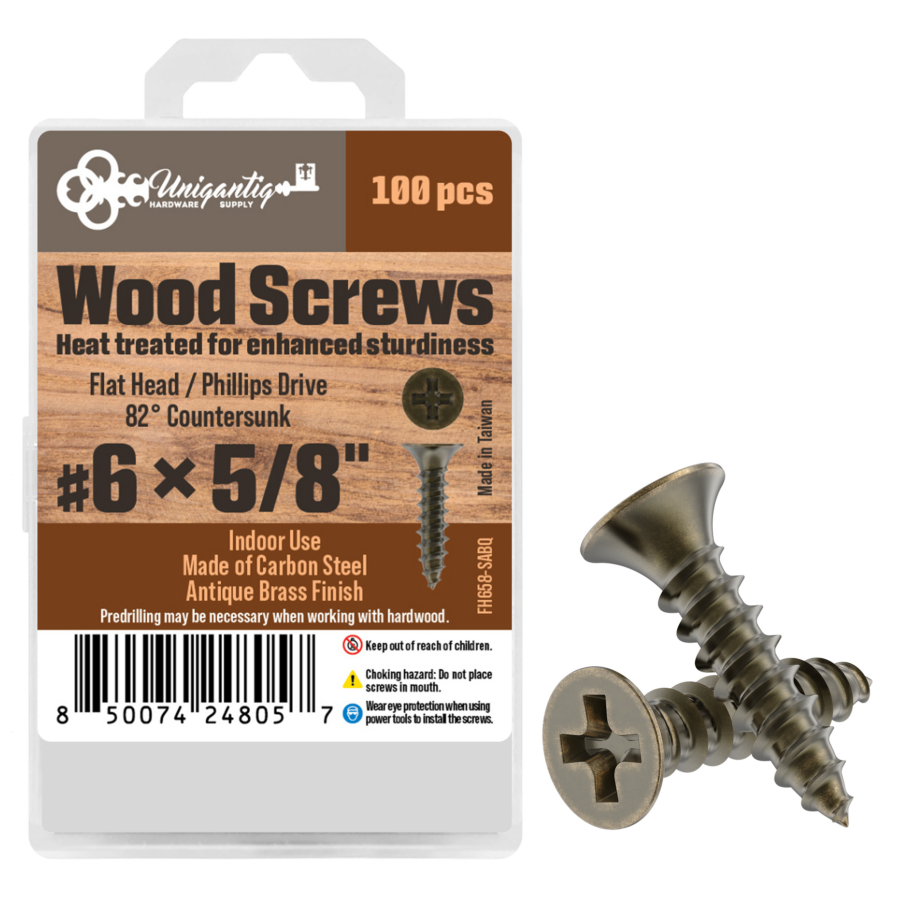 #6 x 5/8" Antique Brass Flat Head Phillips Wood Screws - Pack of 25 - Self Tapping Screws for Wood