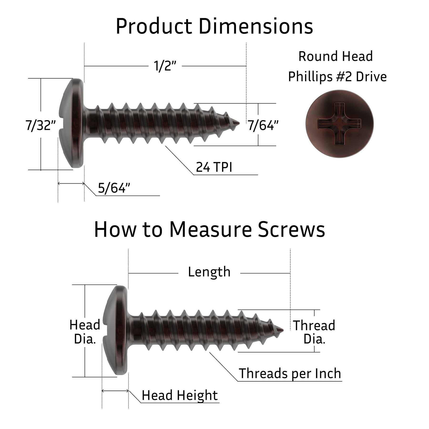 • Round head wood screws are sized at #5 x 1/2.