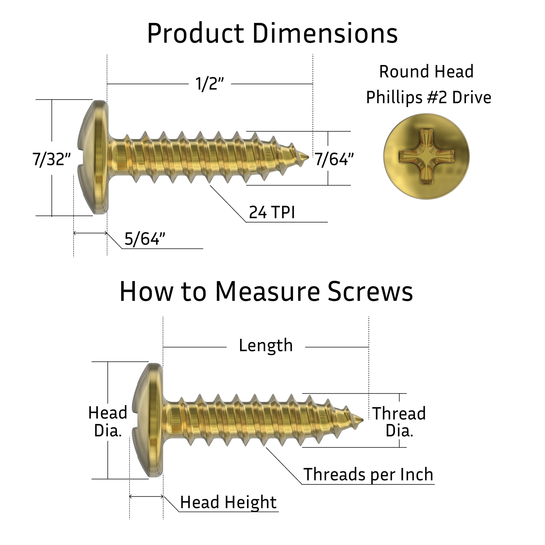 - Round head wood screws are sized at #5 x 1/2.