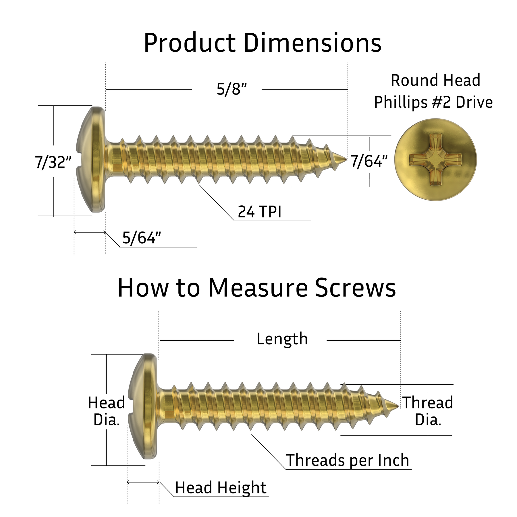 - Round head wood screws are sized at #5 x 5/8".