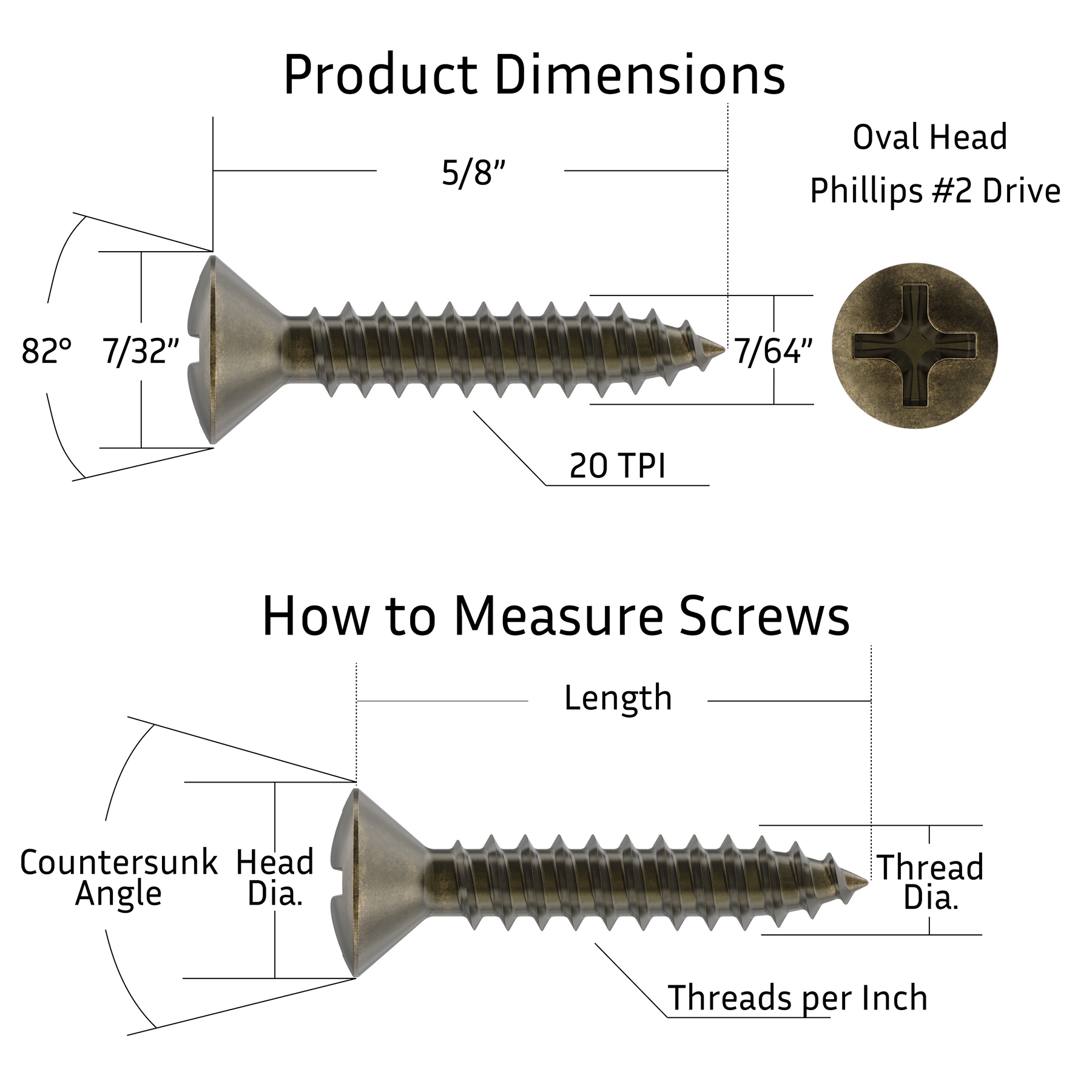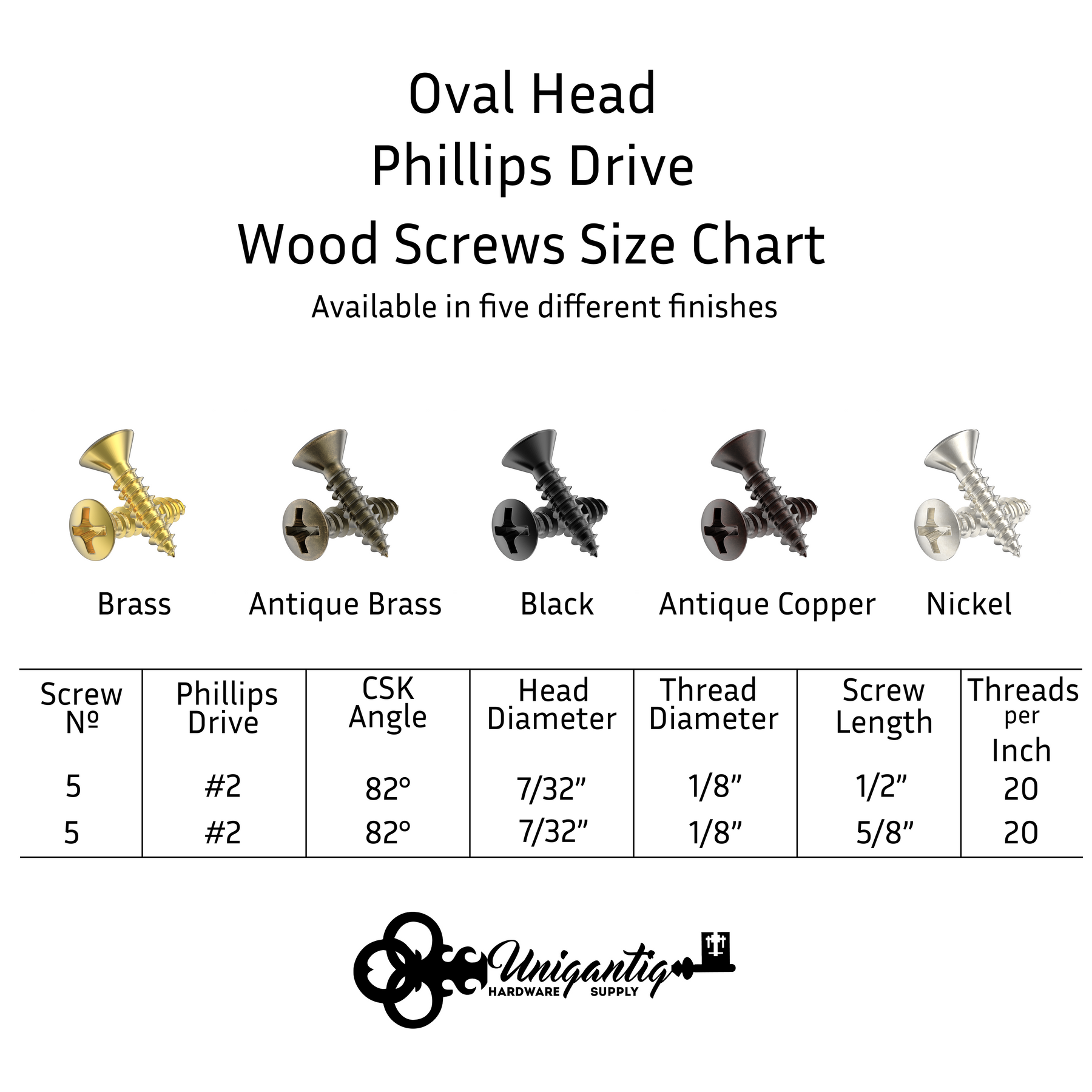 - Oval head wood screws are sized at #5 x 5/8" and feature an 82-degree countersink, allowing the cabinet screws to be set flush with the surface.
