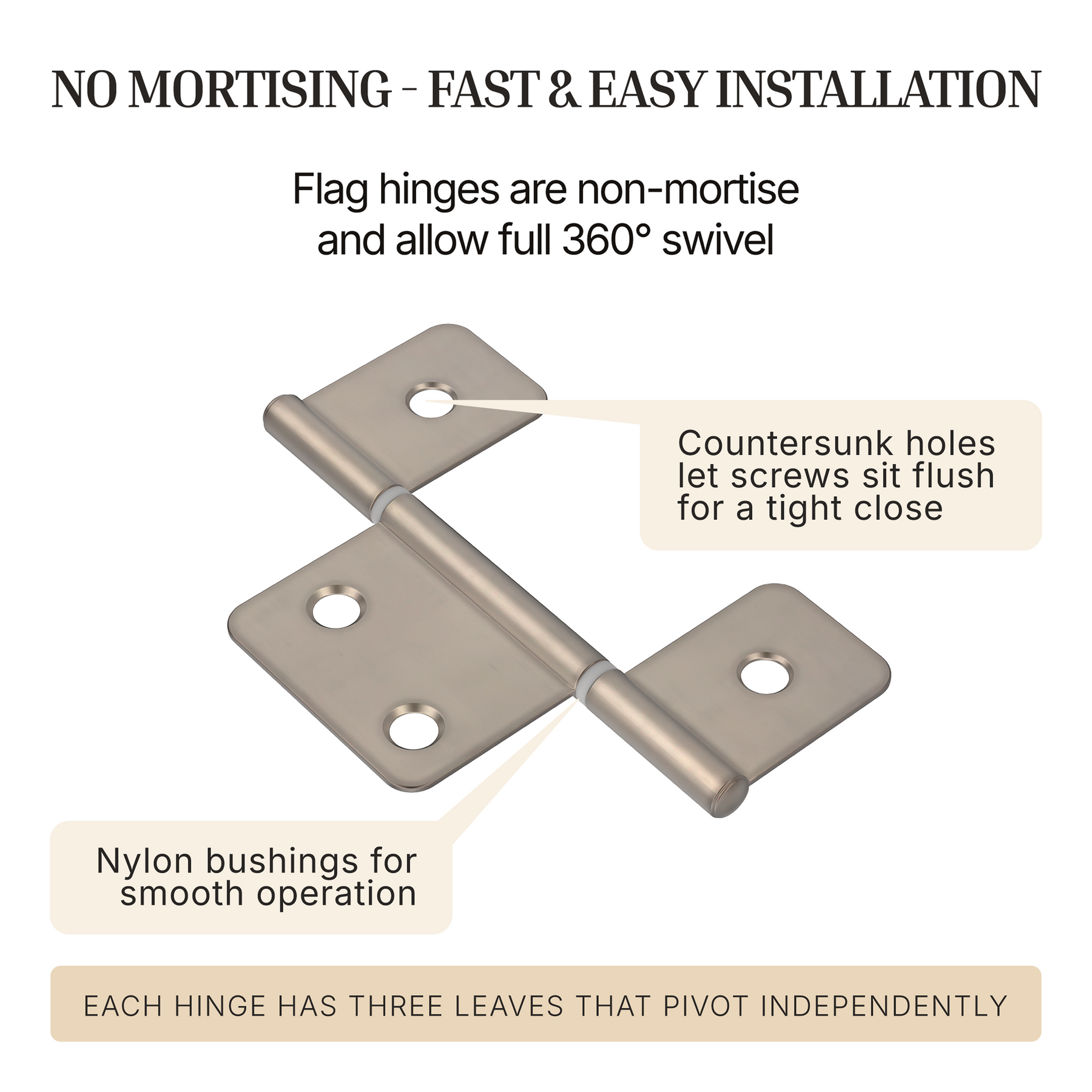 - These three-leaf bi-fold hinges are made of steel with a satin nickel finish applied. Sturdy construction in combination with nylon bushings ensures smooth function and a long lifespan.